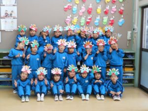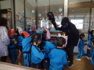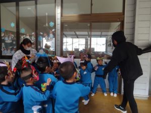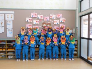 その後は、各クラスに戻り、それぞれ作った鬼のお面を被り集合写真を撮り、