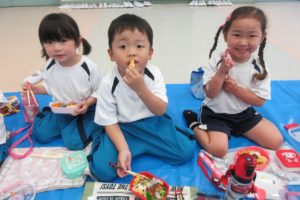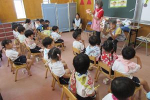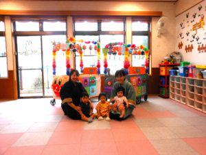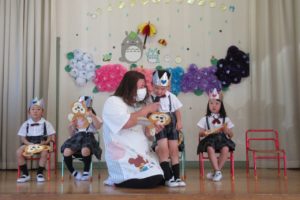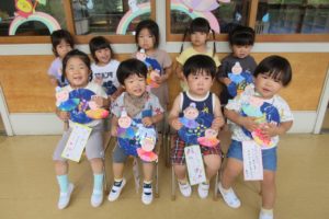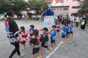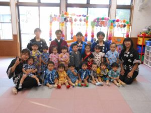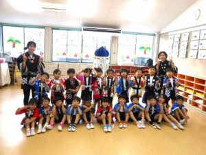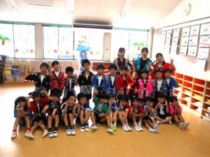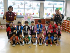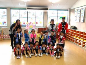 ひよこ組からちきゅう組まで、みんなハッピや甚平姿で登園です。